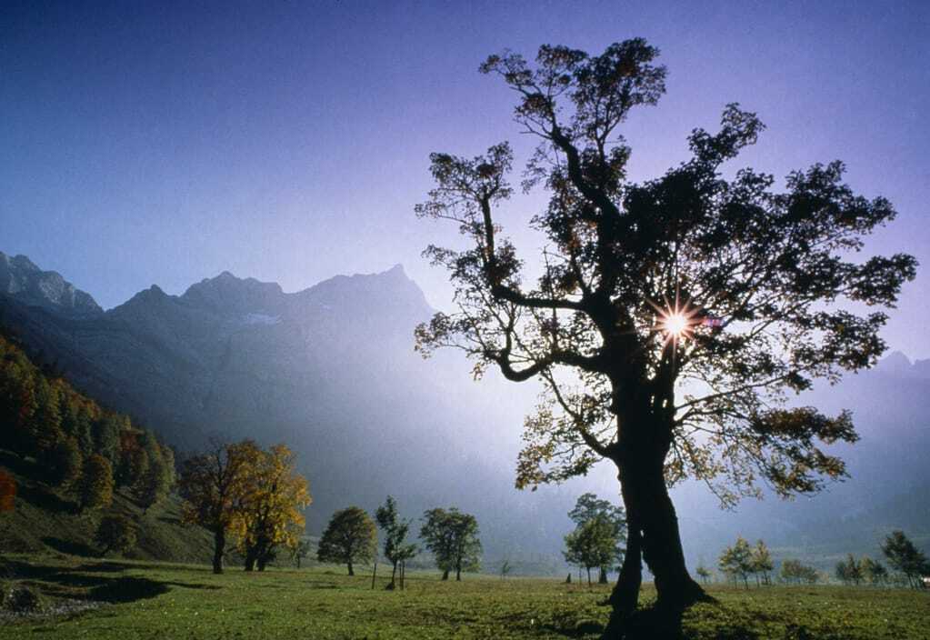 Die beste Zeit, um sich zuvor noch ein "Live-Bild" von dem Naturjuwel Ahornboden zu machen, ist jetzt. Die Wanderung lohnt sich ebenso wie die Fahrt über Bayern herauf. Auf den Almen ringsum lässt es sich gemütlich einkehren, beispielweise auf der Engalm am Ende des Tals mit Schaukäserei und Bauernladen. Eine leichte Wanderung führt vom Großen Ahornboden zur Binsalm mit der kleinen Kapelle aus Karwendelsteinen – und zur Rast beim dienstältesten Senner und Almwirt im Alpenpark Karwendel.