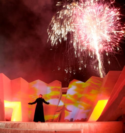 Für Aida – Liebestod in Lech werden die Bregenzer Festspiele die wunderbarsten Momente von Verdis tragischer Liebesgeschichte rund um die schöne Sklavin Aida und den stolzen Heeresführer Radames in eine zauberhafte Landschaft aus Eis und Schnee versetzen. Den Hintergrund für diese Darbietung aus Licht, Feuer und Leidenschaft bildet eine einzigartige Bühnenskulptur aus mehreren hundert Kubikmetern Schnee und purem Eis – aufgeschichtet von den Mannschaften der Bregenzer Festspiele und von Lech-Zürs Tourismus und bearbeitet nach den Entwürfen von Festspiel-Ausstattungsleiter Florian Kradolfer.
