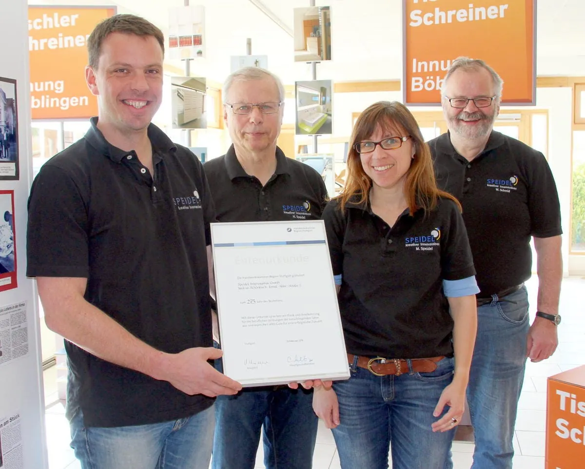 Dass sich die Handwerkstradition lückenlos durch die Familiengeschichte zieht, belegt Horst Speidel mit einer Kopie aus dem örtlichen Kirchenbuch. Nach Glasermeister Christoph Friedrich Speidel, der aus Hagelloch kommend 1739 den Betrieb gründete, folgten dessen Sohn, Enkel und Urenkel: Glasermeister Adam Speidel (1784–1832), Schreiner- und Glasermeister Johann Jakob Speidel (1824–1893) und Schreinermeister Gottlob Jakob Speidel (1876–1963).