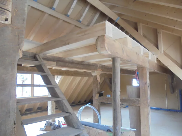 Unter den Dächern des Betriebs finden sich nicht nur Holzvorräte, sondern auch ein Kran, Gabelstapler, Dämmstoffe und Dachziegel. Diese kommen regelmäßig zum Einsatz, denn die Zimmerei bietet ein breites Spektrum an Dienstleistungen: Vom Gerüstbau über Spenglerei und Fenstermontage bis hin zum Dachdecken. "Ich will das jeder Mitarbeiter über den Tellerrand hinaus schaut. Scheuklappen darf niemand haben", betont sie. Die Vielseitigkeit sei eine Stärke des Betriebs. Schließlich könne sie ihren Auftraggebern so alle Arbeitsschritte aus einer Hand anbieten. "Kunden wissen es zu schätzen, wenn sie zu Hause nicht ein Jahr lang Baustelle haben, sondern nur wenige Wochen", sagt sie. Durch den guten Ruf mangele es nicht an Nachfrage und auch die Azubisuche sei kein Problem. "Der nächste Lehrbub' ist schon gefunden", versichert Hotz.