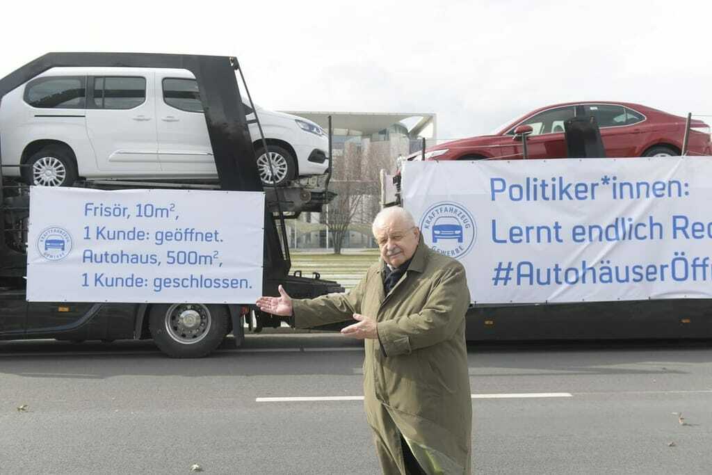 Drei plakatierte Autotransporter sorgten am Donnerstag für Aufsehen in Berlin. Der Zentralverband Deutsches Kraftfahrzeuggewerbe (ZDK) forderte am Kanzleramt eine Öffnung des Autohandels. Verbandspräsident Jürgen Karpinski kassierte dafür eine Anzeige.