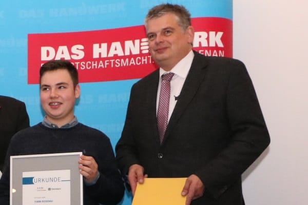 Tobin Rosenau hat eine praktische App für Handwerker entwickelt. Er gehört zu den drei Preisträgern der Aktion "App-Champion des Handwerks 2016/2017", die auf der Vollversammlung der Handwerkskammer Wiesbaden geehrt wurden. Initiatorin des Projekts ist Sonja Salmen, Professorin an der Hochschule Heilbronn. Der Wettbewerb wurde zum ersten Mal ausgeschrieben.
