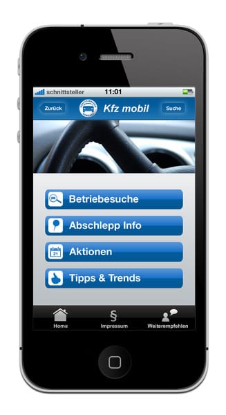 Die Handy-App "Kfz mobil" hilft Autofahrern per GPS oder PLZ schnell einen Kfz-Betrieb zu finden. Zwischen rund 50 Automarken und 40 Leistungen – von Abgasuntersuchung bis Versicherungsvermittlung – kann der Autofahrer wählen.