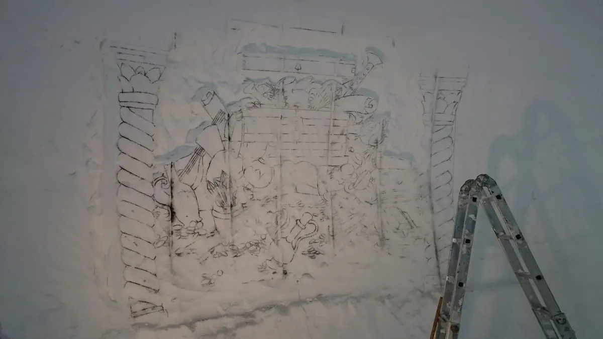 Ihre Ideen sprühen die Profis mit Spraydosen auf das Eis oder sie formen die Skulpturen freihändig nach den Mustern in ihrem Kopf. Zuvor müssen jedoch erstmal die Iglus aufgebaut werden. Dies geschieht mit Hilfe spezieller orangefarbener Ballons aus robustem Kunststoff. Die Ballons werden an der Stelle des neuen Iglus aufgestellt und mit Schnee überschüttet. Der Schnee wird verdichtet und anschließend die Luft aus dem Ballon gelassen. Fertig ist das Hotelzimmer.