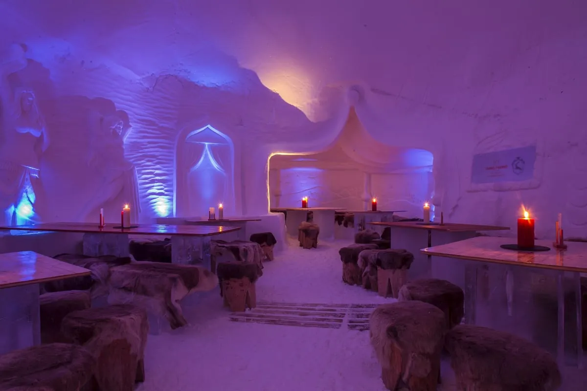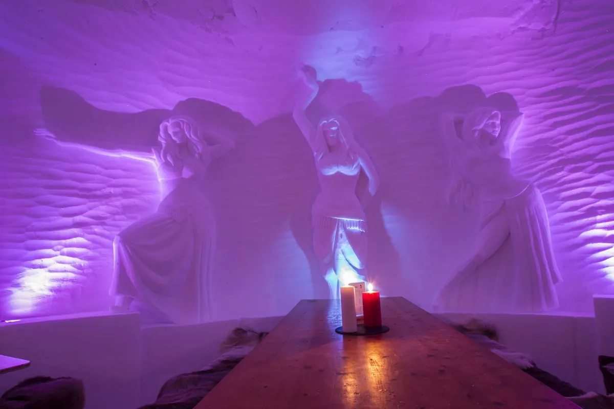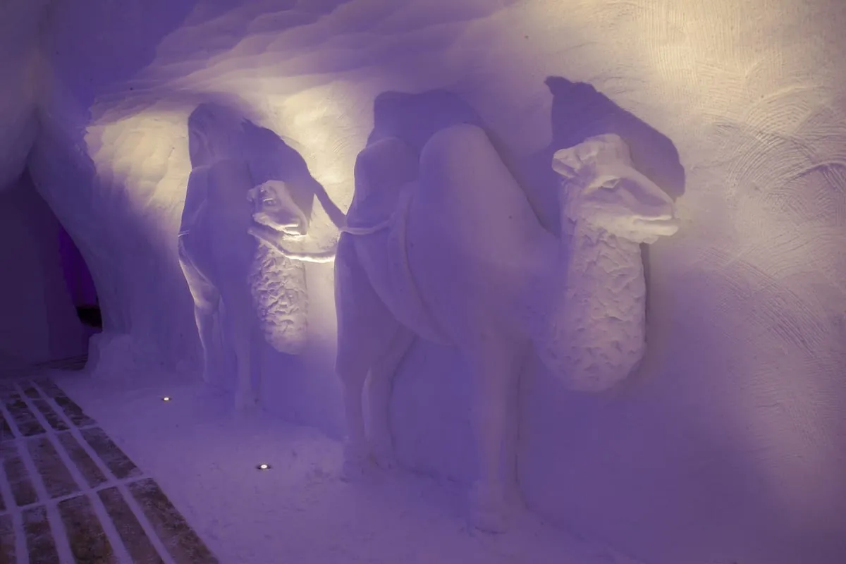 Der Clou an den Iglus sind die kunstvollen Eisschnitzereien im Innern. Jedes Zimmer wird individuell gestaltet. Dieses Jahr steht das Projekt unter dem Motto "1001 Nacht – Orient". Löwen, Flaschengeister und Kamele verzieren die Eiswände des Hotels. In jedem Raum lässt sich ein anderes Motiv entdecken.