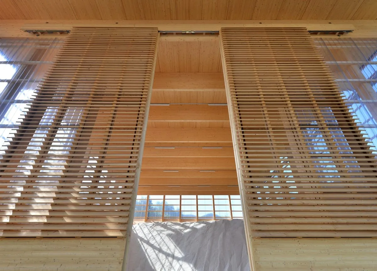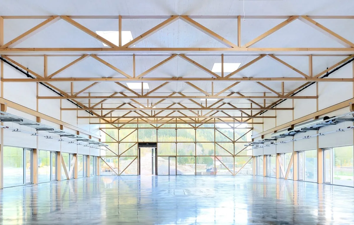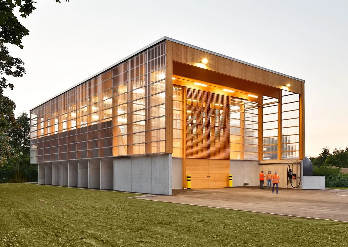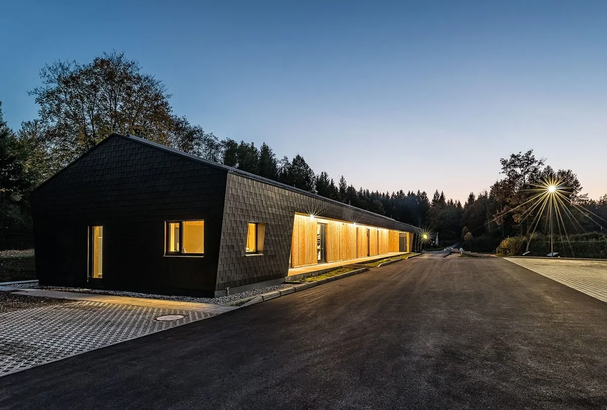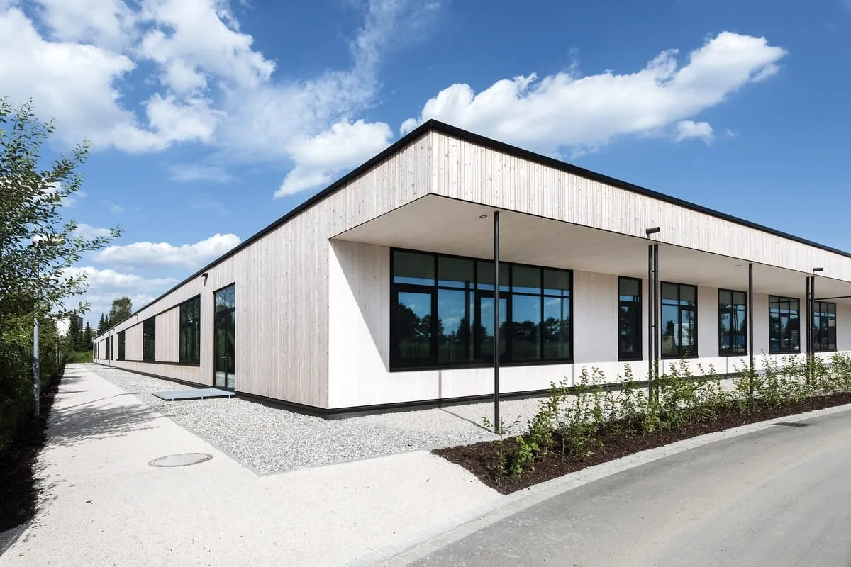 Das Betriebsgebäude setzt Maßstäbe in Punkto Nachhaltigkeit und Design. Der Bau besteht aus einem flachen Kopfbau mit Büros und einer Produktionshalle. Das 25 Meter spannende Holztragwerk der Halle wurde filigran als Fachwerkträger in Buchen-Schichtholz konzipiert. Über dem gläsernen Sockelgeschoß liegt leicht verschoben das geschlossene Volumen des Luftraums der Halle und erzeugt ein spannungsvolles Verhältnis…