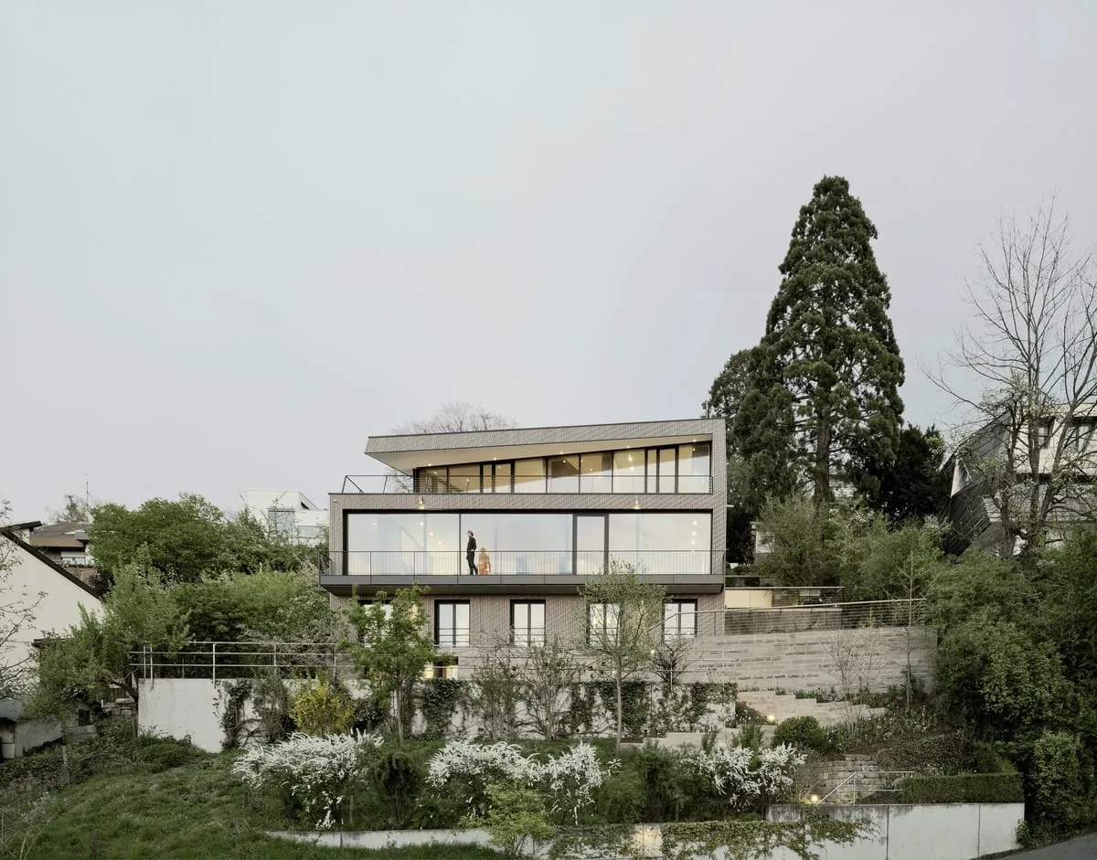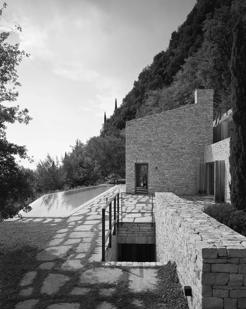 Am Steilhang, rund 300 Meter über dem Westufer des Gardasees, im parkartigen Außenbereich mit fantastischem Blick auf den Lago, reicht die Grundfläche eines alten Rusticos nicht aus, um das geforderte Raumprogramm für ein Wohnhaus mit Gästetrakt aufzunehmen. Damit ein Baurecht erzielt werden kann, sind die Nebenräume im Hang bergmännisch/unterirdisch angeordnet und treten somit als Volumen nicht in Erscheinung. Ein spektakulärer Infinity-Pool folgt den Höhenlinien…