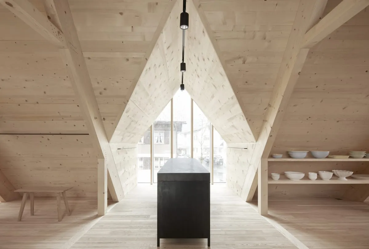 … Das Gebäudeinnere wird geprägt durch die direkte Wirkung der rohen Oberflächen, die sichtbare Massivholz-Konstruktion und einfache, handwerkliche Details. In diesem Sinne ist auch das Tragwerk konzipiert. Dem vorgefertigten Holzskelettbau werden die gedämmten Außenbauteile aus Massivholz vorgehängt.
