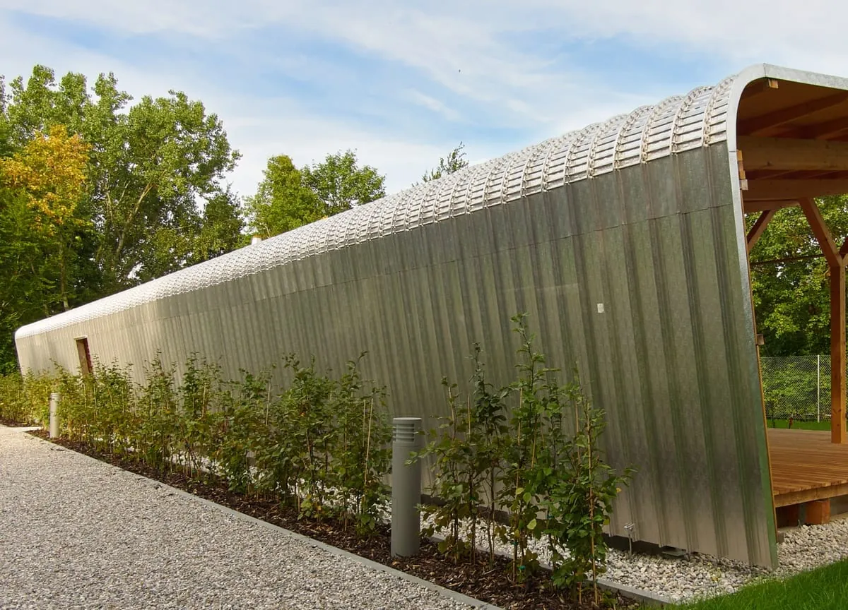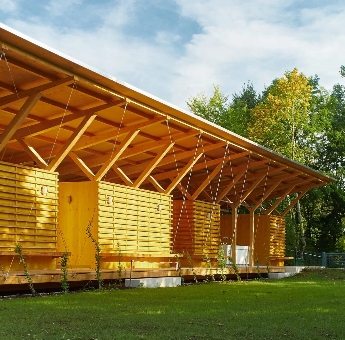 Das unbeheizte, ausschließlich in den Sommermonaten genutzte Gebäude wurde in weitestgehend sichtbar bleibender Holz- Rahmenbauweise erstellt. Das Dach sowie die westliche, geschlossene Rückwand sind mit rohen Aluminium-Profiltafeln bekleidet.