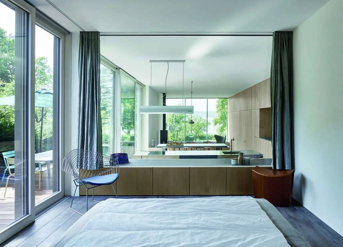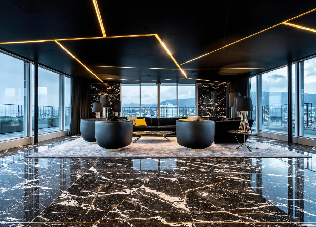 … Als Reminiszenz an die Architektur werden die klassischen Materialien in ihrer Verwendung, Farbigkeit und Glanzgrad neu interpretiert. Die entstandene Raumwirkung rahmt wie ein Passepartout die Aussicht und lässt die niedrigen Raumhöhen aus dem Bestand in den Hintergrund treten. Im Kontrast zum schwarzen Raumkontinuum stehen die glänzenden Möbel.