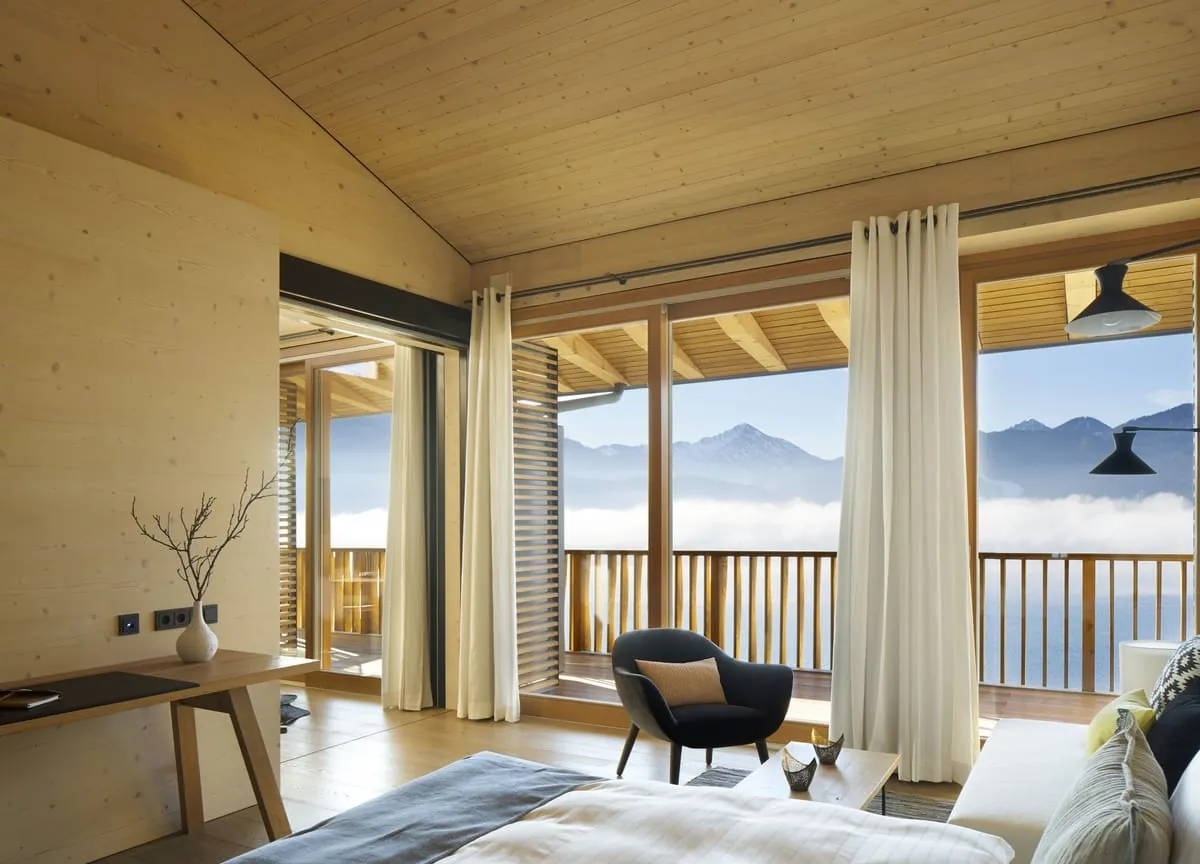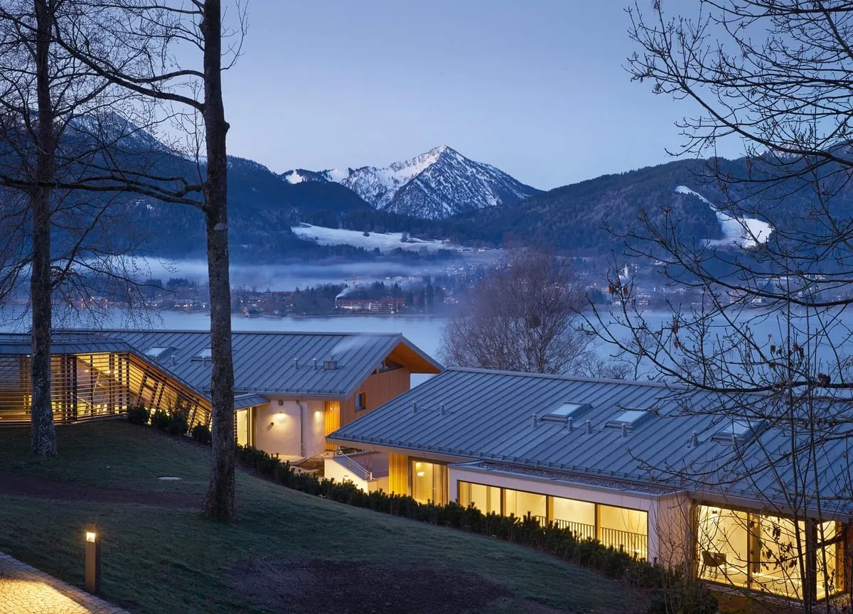 Die zwei Gebäudeteile der Alpenchalets, die direkt miteinander verbunden sind, beherbergen 18 neue, schaltbare Zimmereinheiten auf zwei Ebenen. Im Mittelpunkt der Philosophie der Verortung steht die heimische Natur, der klare Bezug zum alpinen Bauen und die Lage im Tegernseer Tal. Diese wird in Form, Material und Farbe aufgenommen und neu interpretiert…