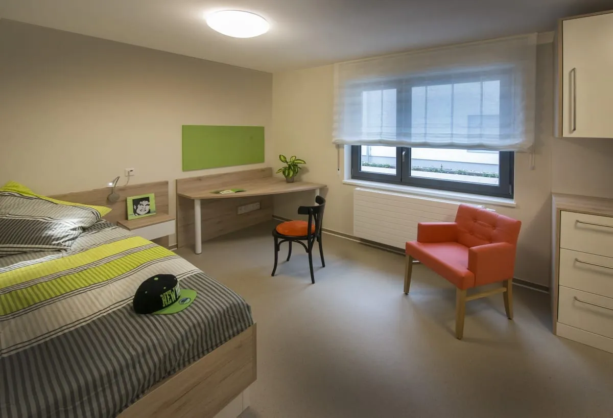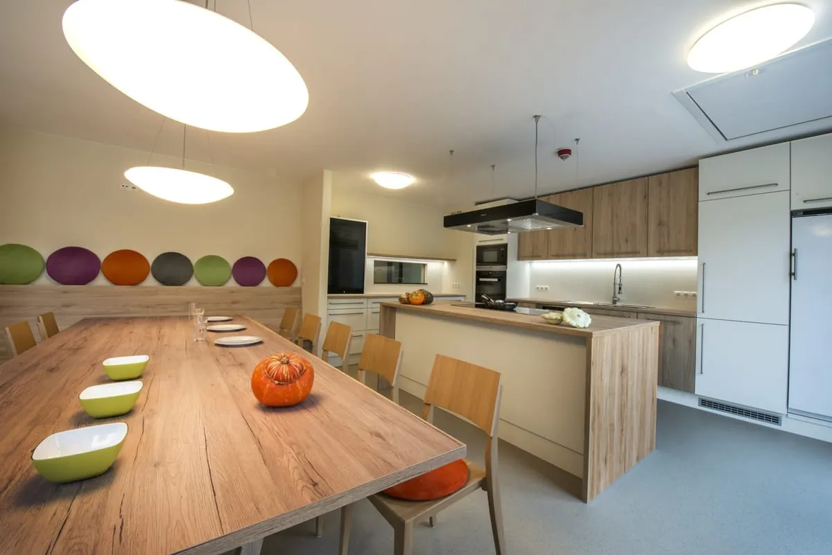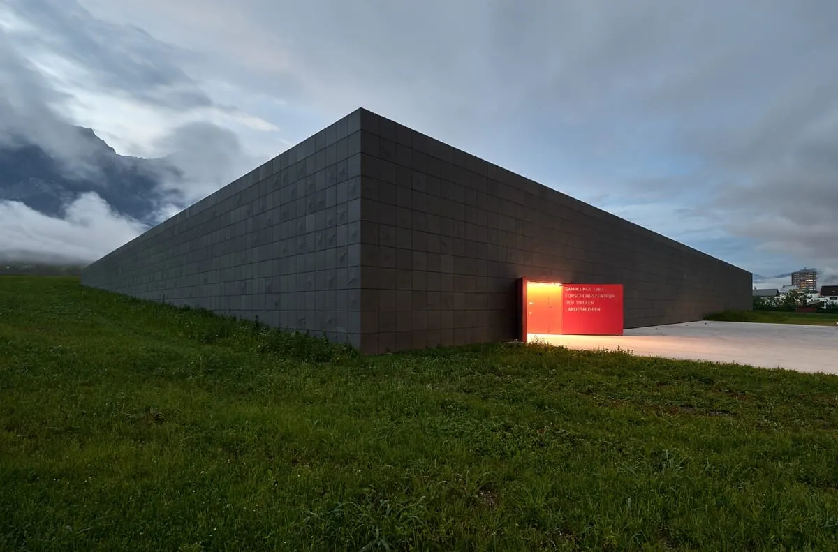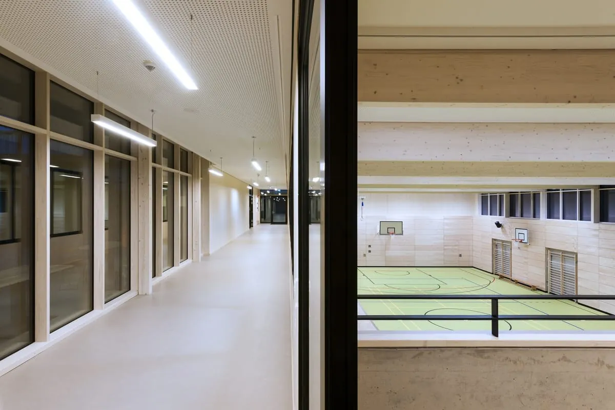 … Die Zugangsbereiche wirken durch den hölzernen Gebäuderücksprung eindeutig und einladend. Die extrem hohen Anforderungen an Robustheit, Schallschutz und Aufenthaltsqualität konnten mit der verwendeten massiven Brettsperrholzkonstruktion in Sichtqualität bewerkstelligt werden. Die robuste Hüllfunktion bildet die lebhafte Titanzinkschindelfassade.