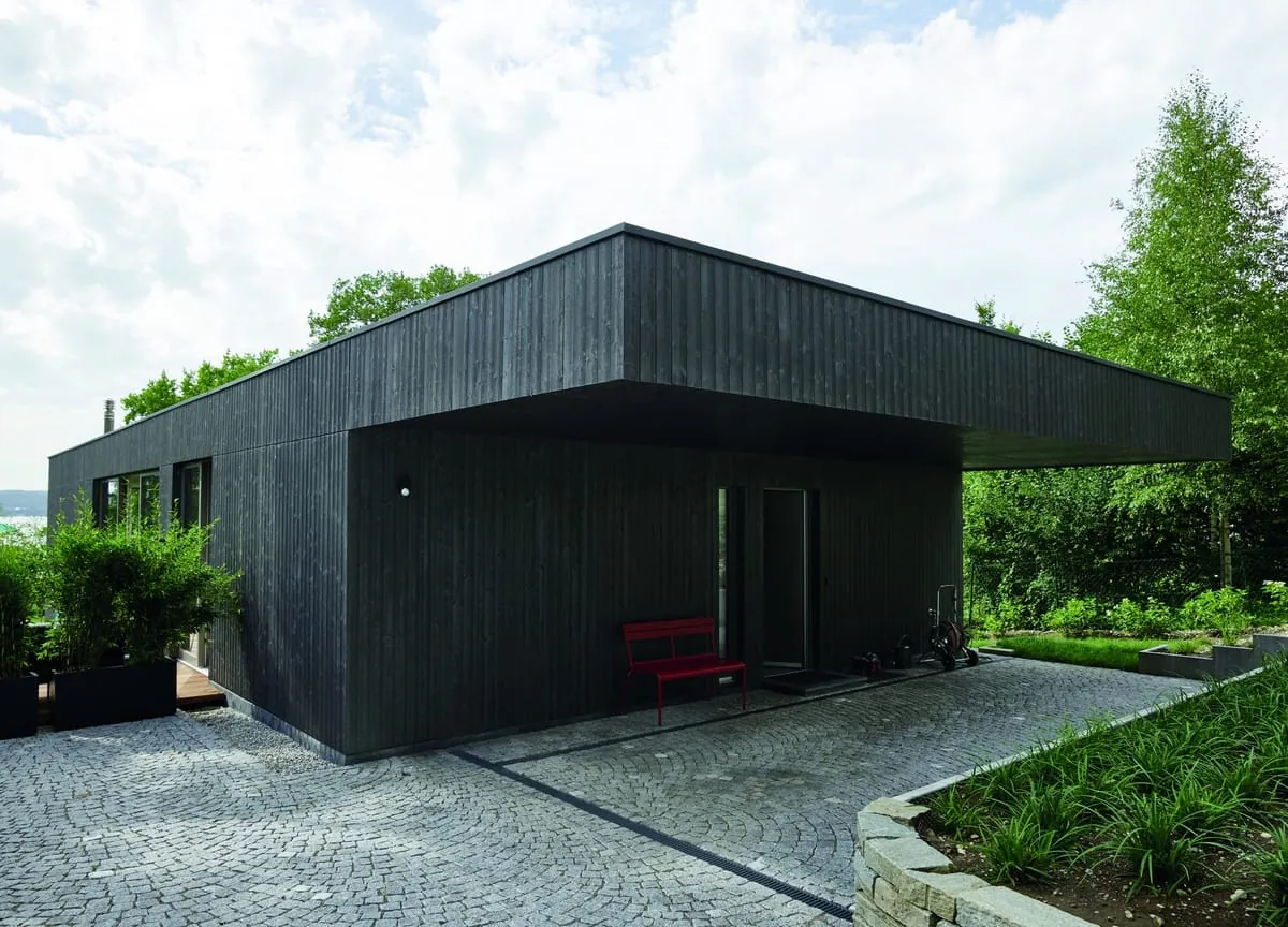 … Auf einem mit Gräsern begrünten massiven Sockel, steht ein langes und „unaufgeregtes“ Holzhaus. Die sägeraue, braun lasierte Schalung nimmt das „Raue“ der Bootshäuser auf und paraphrasiert das typische Materialspiel der oberbayrischen Bautradition.