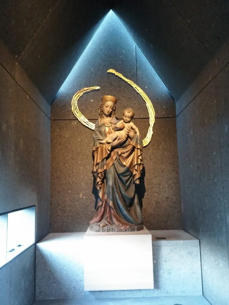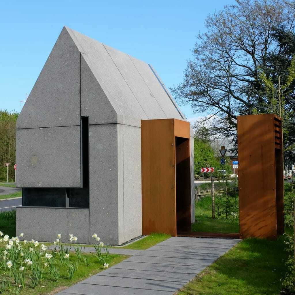 Schwartzenberg überzeugte die Planer mit angepassten Steinschnitten und einer passenden Materialauswahl, denn der Monolith sollte in einem Grauton entstehen. Die 25 Zentimeter dicken Trachytplatten hat Schwartzenberg in einem italienischen Steinbruch persönlich ausgesucht. Die bis zu 16 Tonnen schweren Kaventsmänner wurden dann in seinem Betrieb so exakt bearbeitet, dass die nötigen Ringanker und Bolzen später nicht zu sehen sind, um das monolithische Erscheinungsbild der Kapelle nicht zu zerstören. Für die Stahlarbeiten wurde der Metallbaubetrieb van Vlodrop aus Viersen gewonnen.