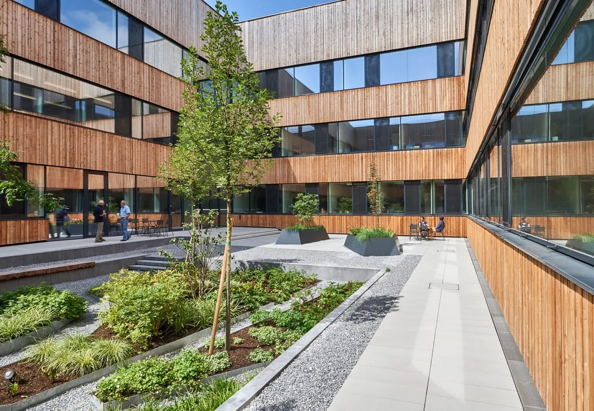 … Neben der kindgerechten Maßstäblichkeit ermöglicht der ebenerdige Holzbau vor allem einen gleichberechtigen Zugang aller Klassenzimmer zum großzügigen Innenhof, dem Zentrum und Herzstück der Anlage. Vom privaten Klassenraum gelangt man über den halbprivaten Naturraum des eigenen Klassengartens in den öffentlichen Pausenhof – individuell und doch gemeinschaftsstiftend. Der zugehörige Montessori-Kindergarten grenzt als funktional autarker Baukörper einen eigenen Grünraum im Osten der Schule ab.