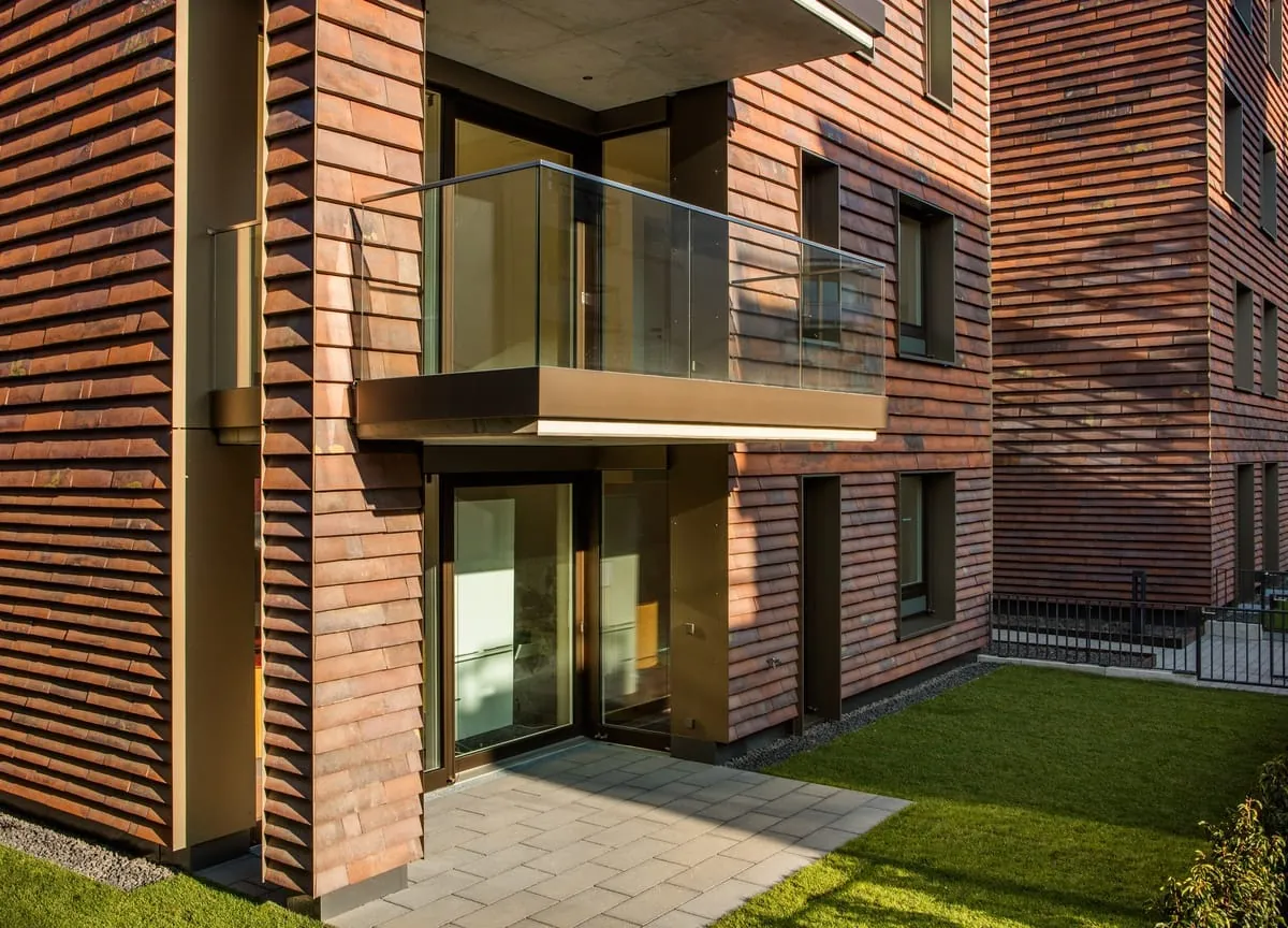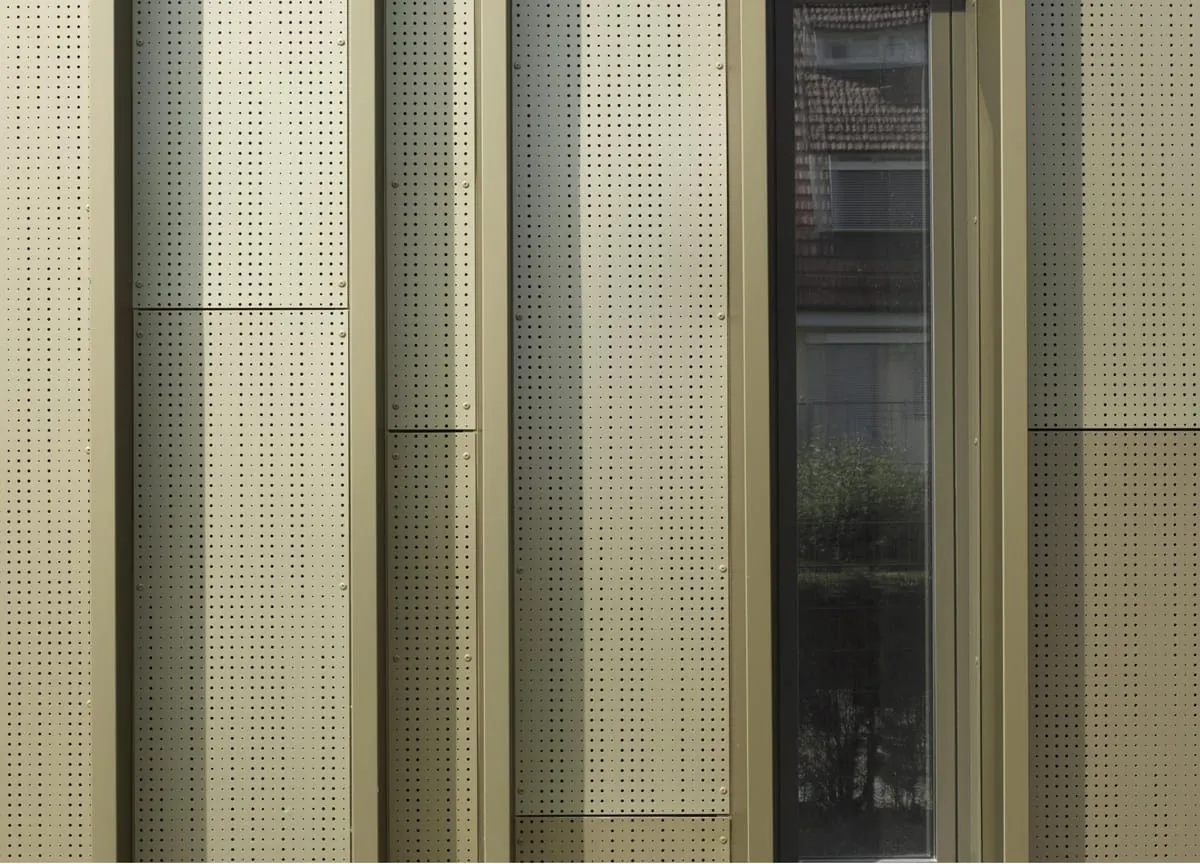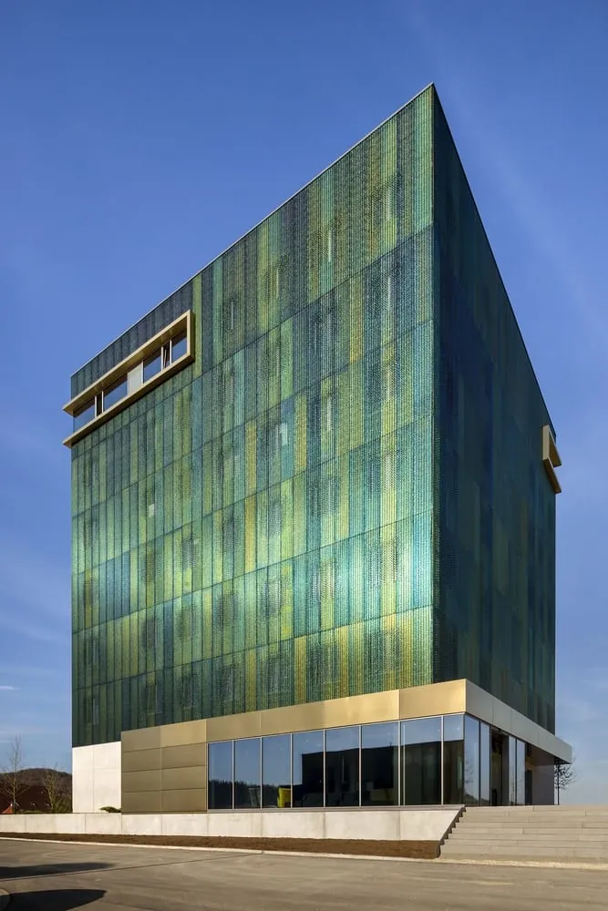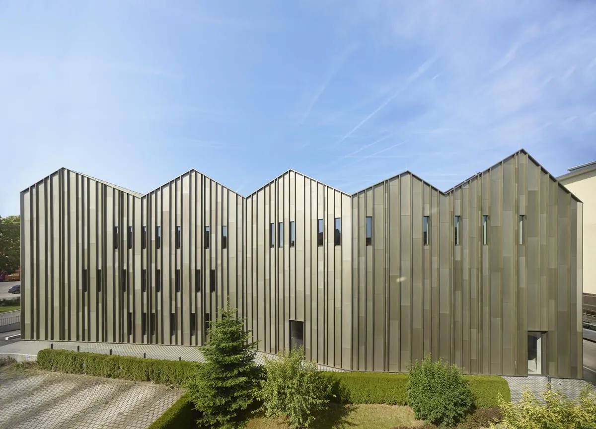 … Prägendes Fassadenelement sind handgefertigte Ziegel (lat. Tegula), welche sich vom Sockel über die Fassadenflächen bis über das Dach legen. In Kombination mit Eloxaltönen der Fassadenprofile und der Laibungsverkleidungen entsteht ein zeitlos wertiges Gebäude von hoher Beständigkeit und eigenständiger Ausstrahlung.