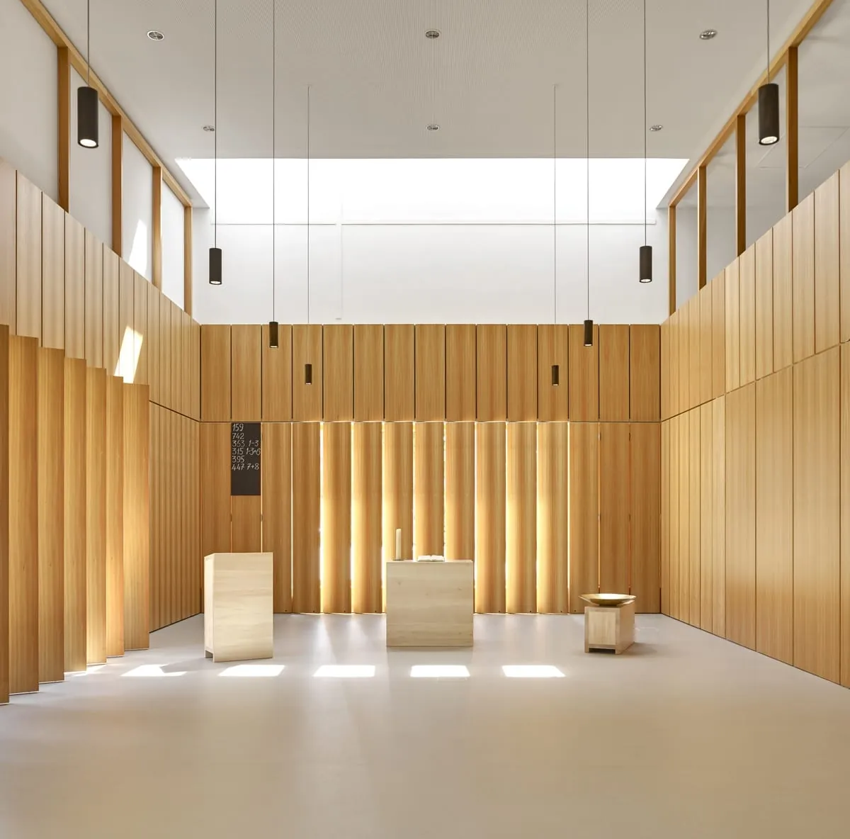 … Im Inneren ein Ausbau aus Lärchenholz, der verschiedene Nutzungen birgt, im Saal sorgen flexible Lamellen für ganz unterschiedliche Atmosphären. An prägnanten Stellen des Hauses wird das Holz aus dem Inneren außen sichtbar, prägnant gerahmte Holzfenster gewähren Einblicke in das Gemeindeleben. Es ist ein Haus entstanden, das einen ruhigen, zeitgemäßen, bei allem Neuen doch auch vertrauten Ort schafft und das für Jung und Alt ein zentraler Ort im Stadtteil werden kann.