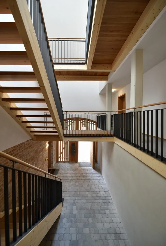 … Hinter den ehemaligen Toren befinden sich nun die Haupttreppenhäuser. Im alten Hof vorhandene Gestaltelemente wie Holzläden, Holztore, Putzfaschen, handwerkliche Putzstruktur und Sichtmauerwerk kamen wieder zum Einsatz. Entstanden sind so neun 2-4 Zimmerwohnungen mit Carports.