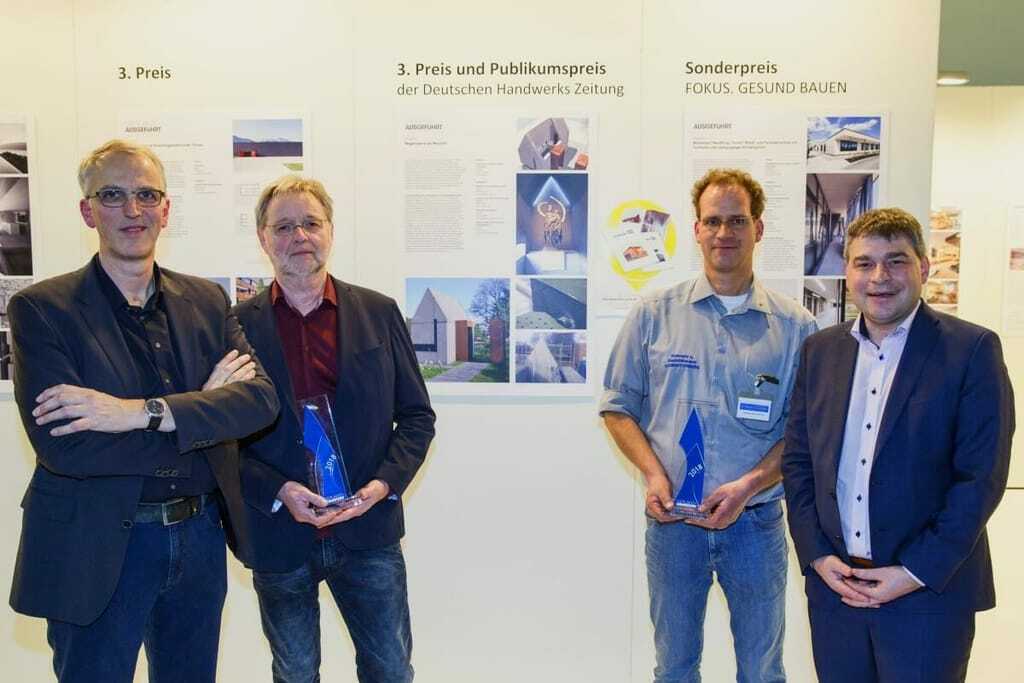 Architekt Gregor Dewey, Künstler Jürgen Drewer und Steinmetzmeister Christiph Schwartzenberg erhielten von Steffen Range, Chefredakteur der Deutschen Handwerks Zeitung (v.l.), die Pokale für den Publikumspreis. - © Michael Schuhmann