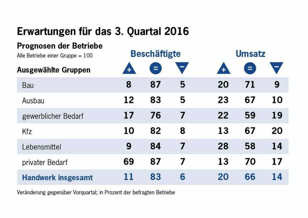 Das Handwerk für gewerblichen Bedarf, das zuliefernde Betriebe und Dienstleister für Industrie und Handel umfasst, ist davon noch wenig beeindruckt. Die Auftragseingänge der Gruppe übertrafen das Vorjahresniveau. Zumeist sind die Kunden einheimische Unternehmen, so dass Exportprobleme erst zeitverzögert im Handwerk ankommen.