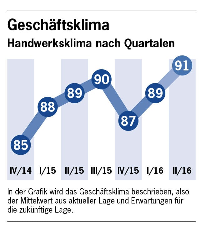 Als wichtigster Indikator für die Stimmung im Handwerk gilt die aktuelle Geschäftslage. Im zweiten Quartal 2016 beurteilten neun von zehn Firmen ihre Situation mit gut oder befriedigend. Besser war die Lage im Frühling noch nie. Am oberen Rand der dokumentierten Werte findet sich auch die Kapazitätsauslastung. Zwischen April und Juni erreichte sie im Durchschnitt 80 Prozent.