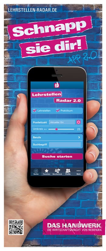 Bei der Lehrlingssuche geht das Handwerk innovative Wege – selbstverständlich auch über die neuen Medien. Etwa mit einer Smartphone-App, mit der das Handwerk nicht nur in Sachen Lehrlingssuche auf digitalem Erfolgskurs liegt. Auf der CeBIT in Hannover wurde das „Lehrstellenradar 2.0“ als beste Verwaltungs-App Deutschlands ausgezeichnet.