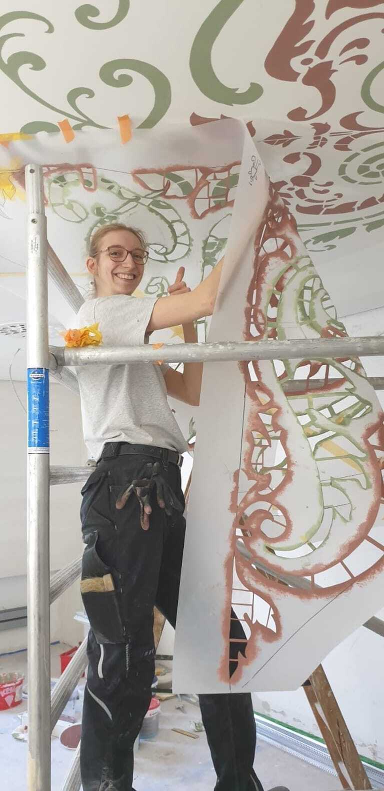 Ich bin seit einem Jahr Gesellin in meinem Ausbildungsbetrieb. Von 2021 bis 2024 habe ich meine Ausbildung zur Malerin und Lackiererin mit der Fachrichtung Kirchenmalerei und Denkmalpflege im nordrhein-westfälischen Rüthen absolviert. Ich habe immer offen mit meinem Betrieb kommuniziert. Sie freuen sich für mich, haben mich immer unterstützt und stehen meiner Entscheidung positiv gegenüber, da von Anfang an klar war, dass ich nicht für immer dort bleiben werde. Es ist ein kleinerer Betrieb mit familiärer Stimmung, deshalb gab es da keine Probleme. Nach meinem Jahr in den USA werde ich voraussichtlich noch einmal für zwei Monate dort arbeiten, bevor es für mich nach Wien geht. Dort habe ich einen Studienplatz für Konservierung und Restaurierung erhalten.