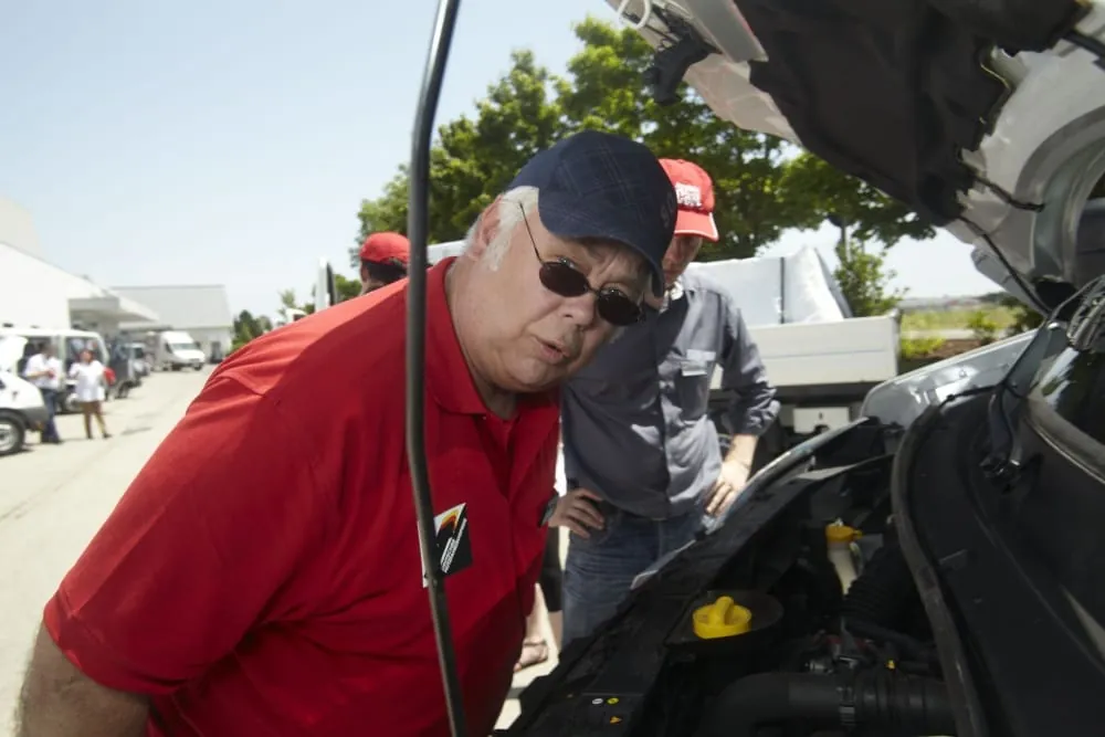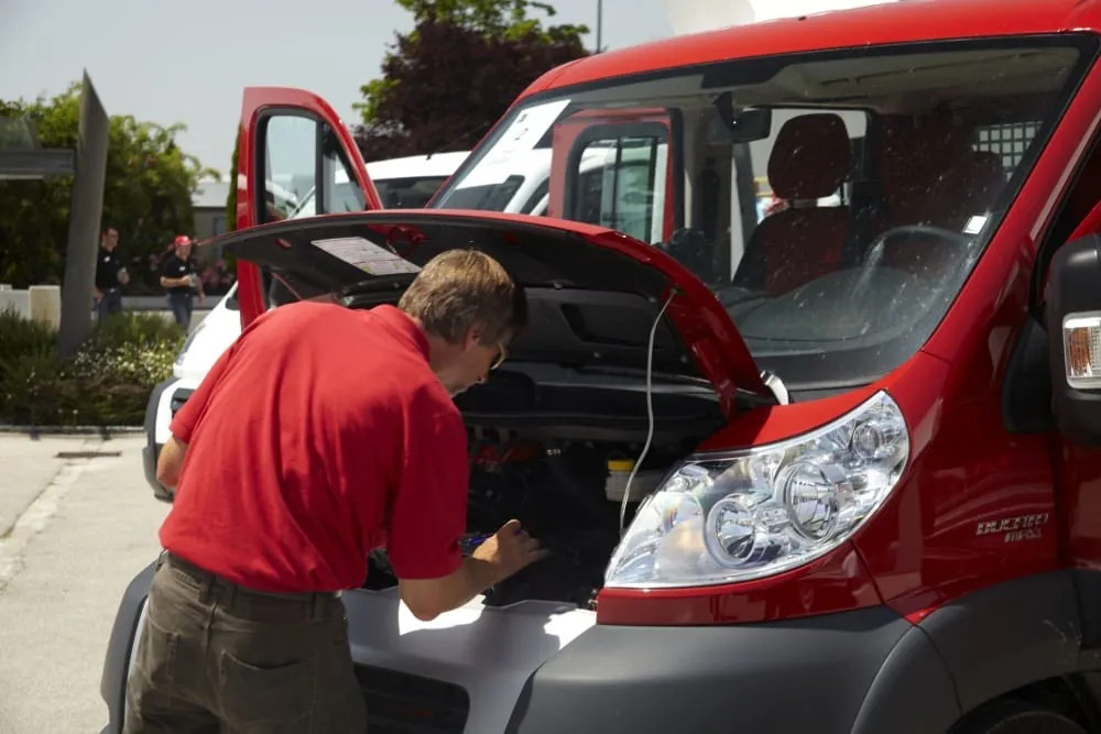 Robert Klauer, Kreishandwerksmeister aus Kaufbeuren und Geschäftsführer des Tiefbauunternehmens Rehwald, wirft einen Blick in den Motorraum des Fiat Ducato.