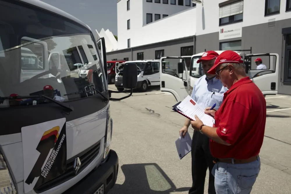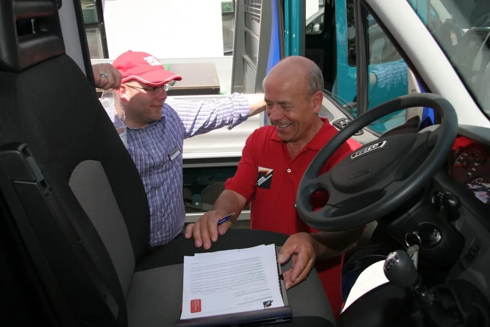 Thomas Schindler (re.), Geschäftsführer der WIN Wartung und Instandhaltung GmbH in Zwickau, füllt den Fragebogen der Jury aus. Fragen zum Renault Maxity beantwortet Wolfgang Metko.