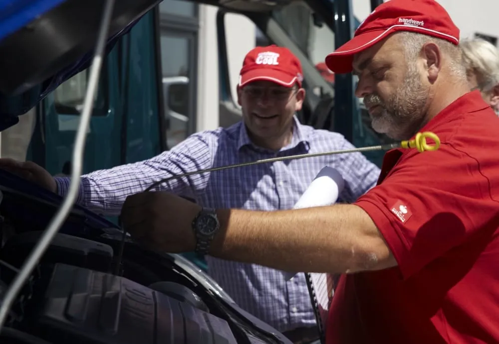 Beim Standtest begutachten die Handwerker wie hier Peter Jacobs, Fuhrparkleiter bei Kähler Bau in Büsum, Motor, Fahrerkabine, Fahrgestell und Pritsche.
