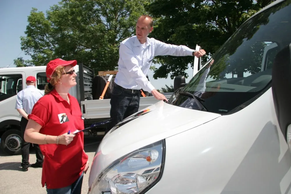 Trotz Sommerhitze denkt Christiane Scharff, Buchhalterin der Gregor Scharff GmbH in Kleve, schon an den Winter und lässt sich von Ralf Benecke zeigen, wie man beim Renault Master zum Kratzen an die Windschutzscheibe kommt. Eine Trittstufe in der Stoßstange verhilft nach oben.