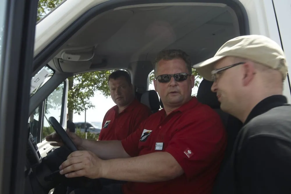 Peter Schmitt (li.), Geschäftsführer des Bauunternehmens August Kröger in Eschwege, lässt sich von Ralf Benecke die Lüftung im Renault Master erklären.
