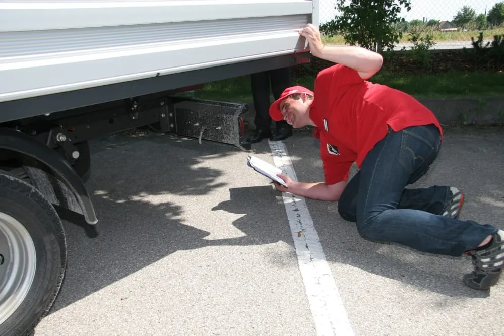 Gerd Franz (li.), Fuhrparkleiter der HSL Laibacher GmbH in Wiesen, prüft die Ladebordwand am Ford Transit, der von Raimund Grosser fachlich betreut wird.