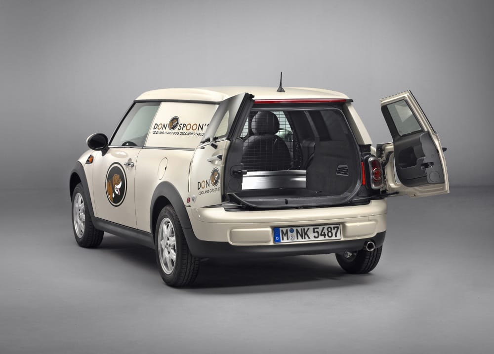 Der Mini Clubvan bietet alle Vorzüge eines typischen Stadtlieferwagens: Die geschlossene Ladefläche reicht vom Heck bis zu den Fahrersitzen, die durch eine Trennwand mit Edelstahlgitter vom Laderaum geschützt sind. Um die steuerbegünstigte Nutzfahrzeugeinstufung zu erhalten, hat BMW auf Sitze im Fond verzichtet und die hinteren Seitenscheiben blickdicht versiegelt.