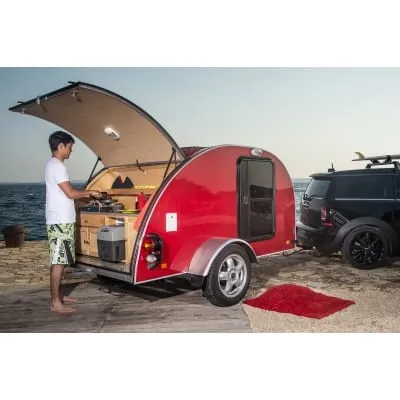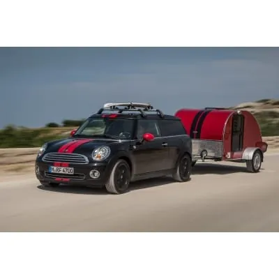 Lackiert in typischen Mini-Farben erweist sich der Caravan als echter Hingucker. Die Silhouette des tropfenförmigen Wohnanhängers erinnert an die geschwungenen Linien der Mini Türverkleidungen und die Türen weisen auf beiden Seiten Schiebefenster auf, die beim Classic Mini bis 1969 Standard waren. Das markant gestylte Caravan-Modell ist nur zwölf Zentimeter breiter als ein Mini Clubman samt Außenspiegel und wiegt knapp 300 Kilogramm.