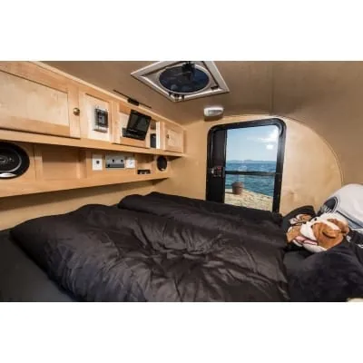 Zwei bequeme Schlafplätze und hinter der weit aufschwingenden Klappe im Heck des Caravans ein zweiflammiger Gaskocher, ein Wassertank samt Pumpe und Spülgelegenheit, ein Solar-Modul zum Aufladen der bordeigenen Akkus und ein 230-Volt-Stromanschluss zur Versorgung des Kühlschranks sowie der TV/DVD- und der HiFi-Stereoanlage.