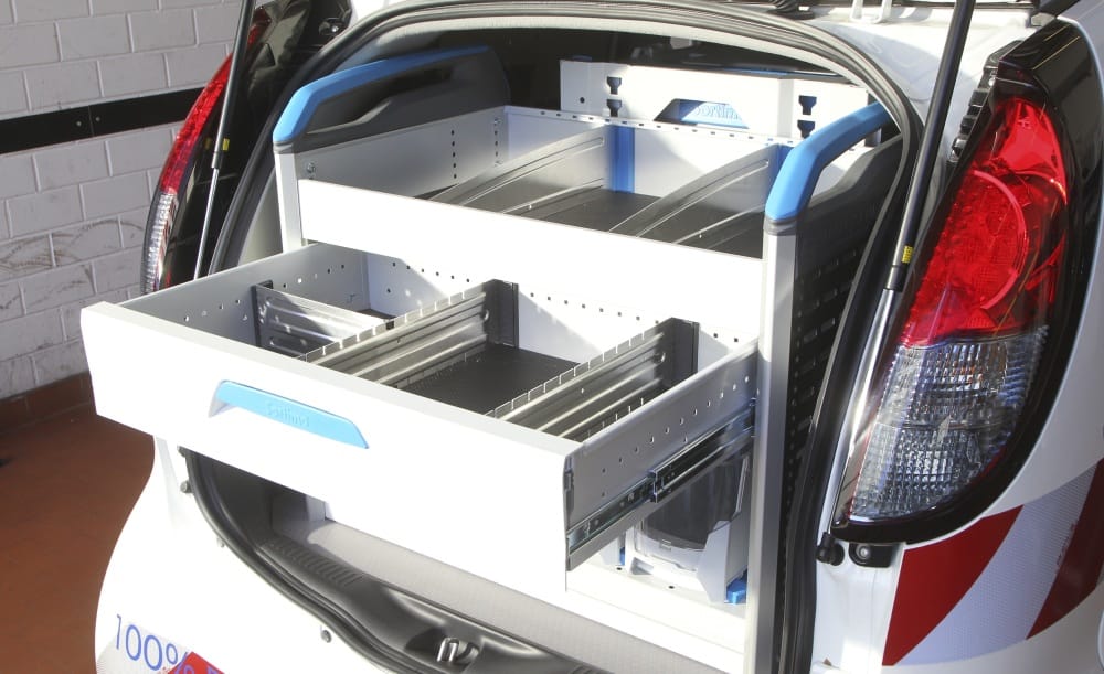 Der neue Citytransporter i0n Cargo, der auf dem gleichnamigen Serienmodell aufbaut, ist mit einem Einbausystem von Sortimo ausgerüstet. Im Heck des Fahrzeuges versprechen ein Einbaublock mit integrierten Schubladen, die aus besonders stabilem Kunststoff gefertigt sind, eine Fachbodenwanne mit Antirutschmatte sowie eine Rückwandblende aus stoß- und kratzfestem Sowaflex einen unkomplizierten und komfortablen Einsatz.