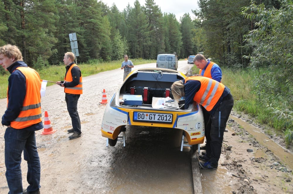 Das ausschließlich mit Sonnenenergie angetriebene Fahrzeug der Hochschule Bochum hat auf seiner Weltumrundung nach der längsten Etappe Wladiwostok im Osten Russlands erreicht. 26.000 Kilometer haben die Studenten um Teamchef Tim Skerra mit ihrem Solarcar nun schon hinter sich gebracht.