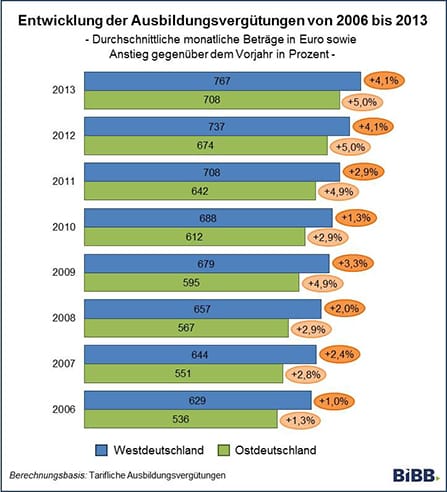 Im Durchschnitt verdiente ein Auszubildender im Jahr 2013 in Westdeutschland 767 Euro brutto im Monat. In Ostdeutschland waren es 708 Euro. Das sind im Vergleich zum Vorjahr 4,1 Prozent mehr im Westen und fünf Prozent mehr im Osten. Prozentual fiel die Erhöhung damit in West und Ost genauso stark aus wie 2012.