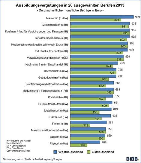 In Westdeutschland waren auch in den Berufen des Bauhauptgewerbes etwa im Beruf Maurer/Maurerin sehr hohe Ausbildungsvergütungen tariflich vereinbart: Sie betrugen dort durchschnittlich 999 Euro im Monat, während sie in Ostdeutschland mit 803 Euro deutlich geringer ausfielen.