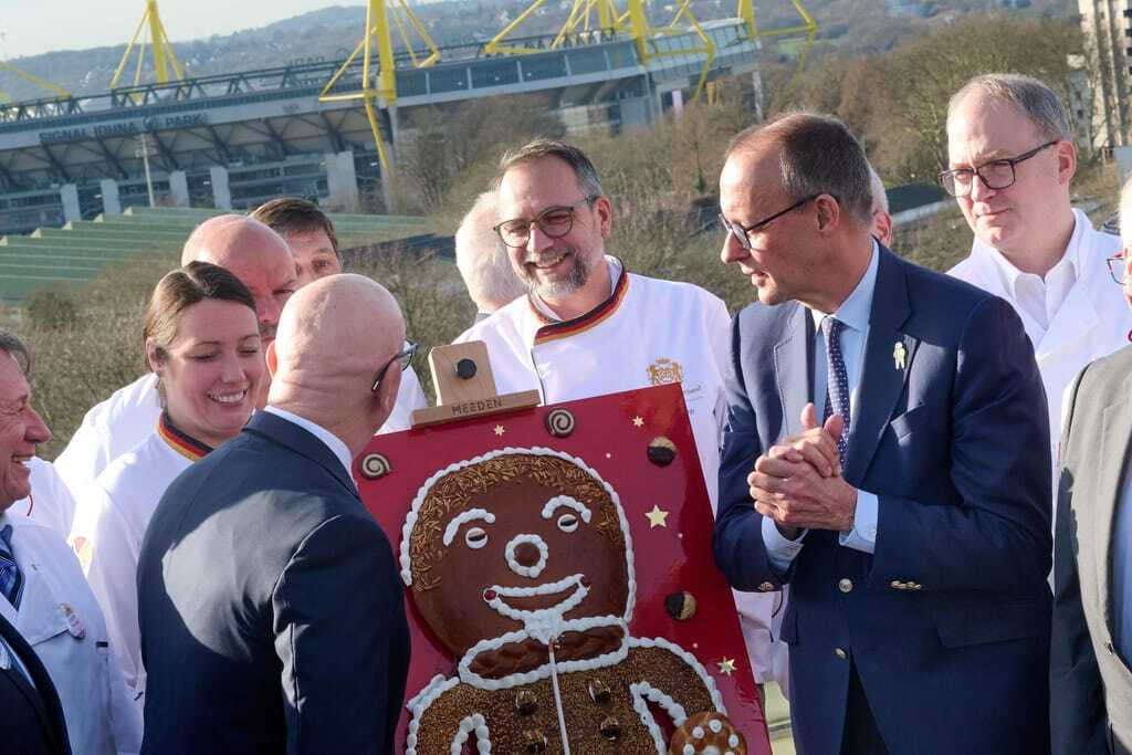 Merz erhielt den 1,2 Meter hohen und zehn Kilogramm schweren "Großen Stutenkerl". Der Verband verleiht das XL-Backwerk seit 1988 an Personen aus Politik und Wirtschaft, die sich besonders um das Bäckerhandwerk oder allgemein das Handwerk verdient gemacht haben.