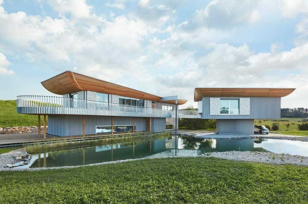 Das Ergebnis heißt "Haussicht", ein Ensemble aus zwei Gebäuden mit kleinem See, das direkt an der Autobahn A 96 bei Erkheim von der Zukunft zeugt.