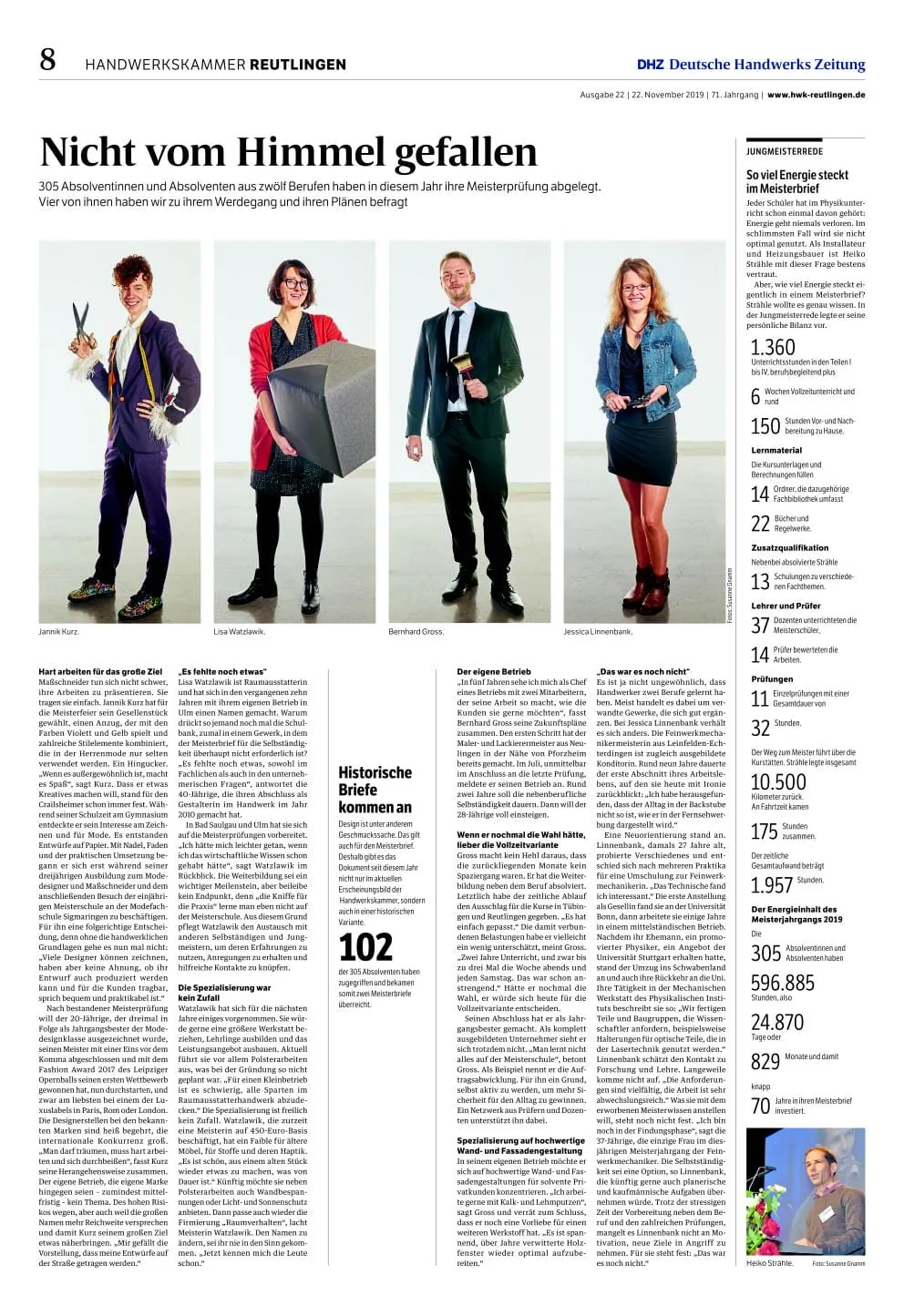 © DHZAttraktives Layout zum Hintergrund einer Meisterfeier: Vier Texte zu vier Personen auf vier gleich fotografierten Fotos. Auflockernde Schiebespalte mit hervorgebobener Zahl sowie Hervorhebungen im Einspalter.