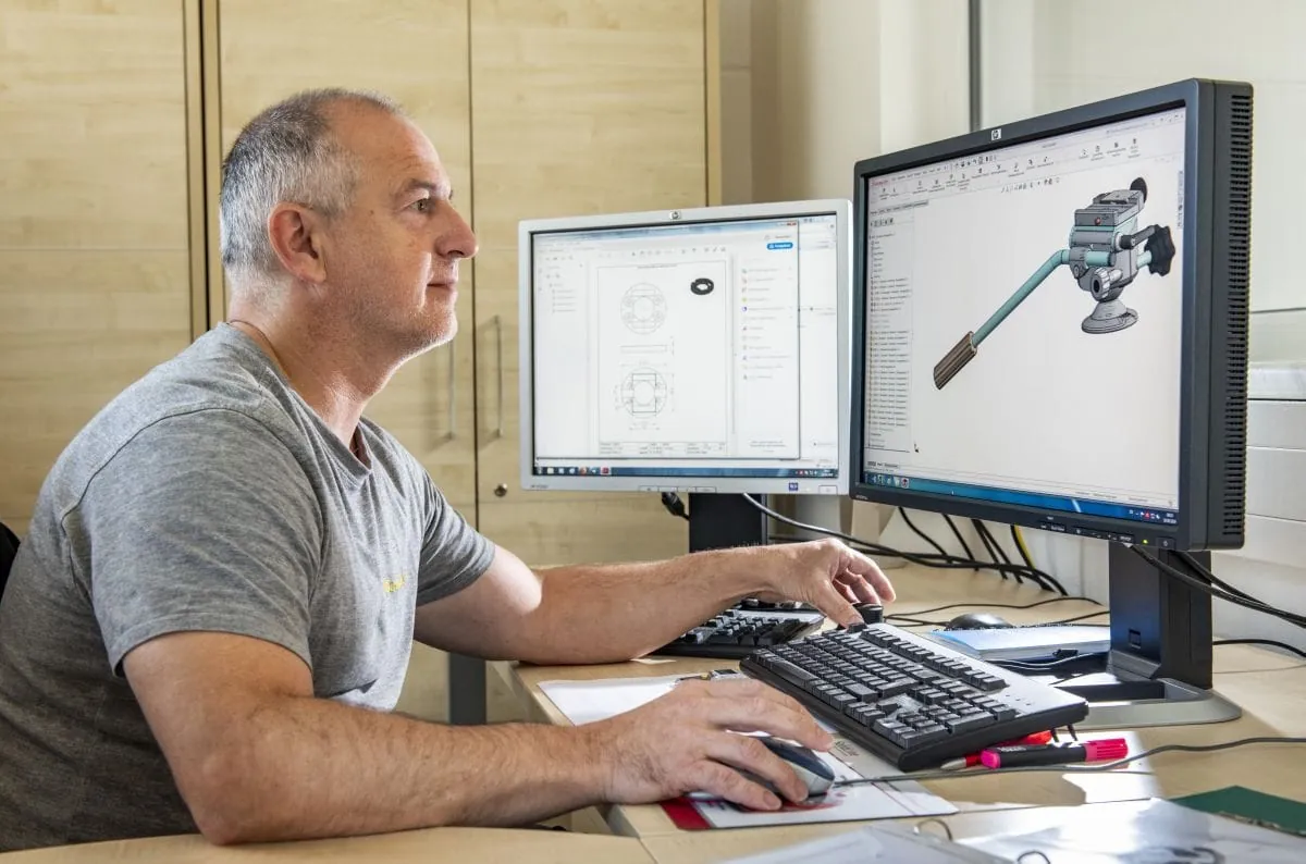Konstrukteur Volker Schulze beim Entwurf eines Stativkopfes.