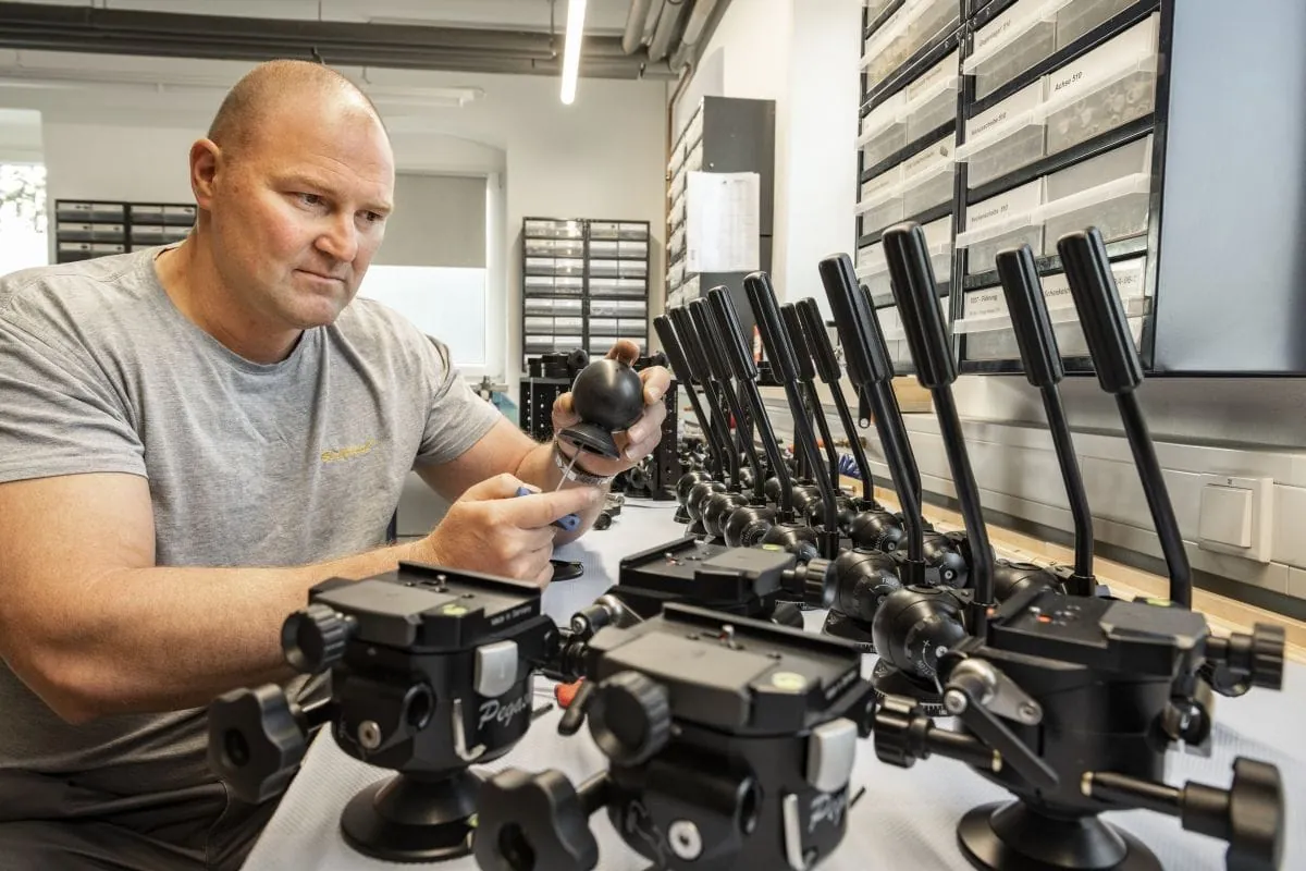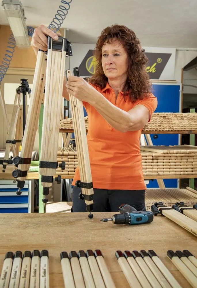 35 Kubikmeter Eschenholz werden pro Jahr in Mulda zu 7.500 Stative verarbeitet – ein Drittel davon für die Profi-Serie. Dazu gibt es jede Menge Zubehör. Durch das Baukastensystem der Produktpalette können sich die Kunden ihr Stativ aus 14 Modulen auf ihre persönlichen Ansprüche konfigurieren. Aber der Markt für Fotografie stagniert. Deshalb fertigt Berlebach inzwischen auch Stative für Astronomen und EMV-Stative, die Hersteller elektrischer Anlagen und Geräte brauchen, um ihre Produkte auf elektromagnetische Verträglichkeit zu prüfen.