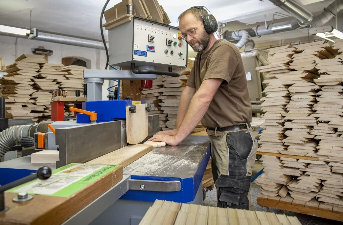 Jan Gernegroß beim Fräsen von Stativbeinen in der Holzfertigung.