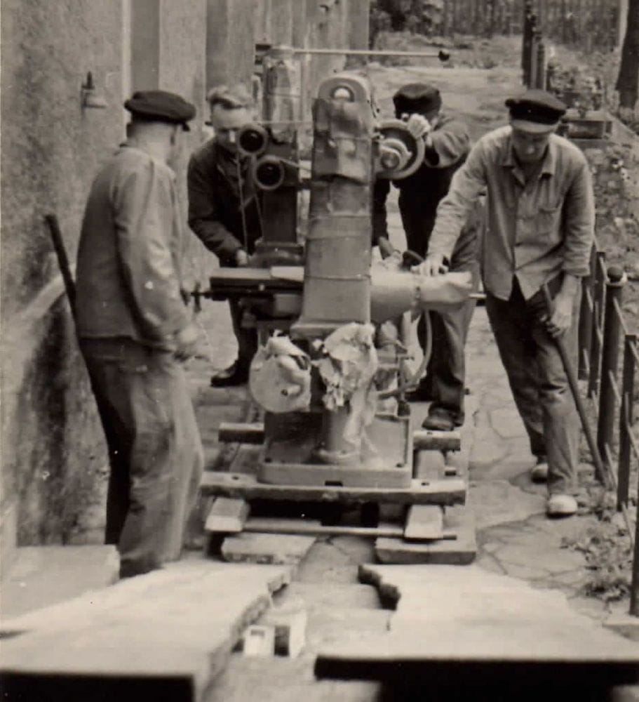 Mit einfachsten Mitteln haben die Mit­arbeiter früher neue Maschinen transportiert. Später gab es in der DDR überhaupt keine neue Technik mehr, der Maschinenpark veraltete zusehends. - © Berlebach