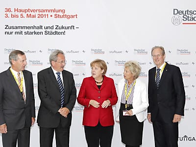 Als ob sie die überparteiliche Zusammenarbeit im Deutschen Städtetag farblich flankieren wollte, kam Angela Merkel in roter Jacke und schwarzer Hose nach Stuttgart. Und tatsächlich wurde die Kanzlerin am Ende ihrer Rede in der Stuttgarter Liederhalle am Mittwoch von den Kommunalpolitikern aus dem gesamten Bundesgebiet einhellig mit starkem Beifall bedacht.