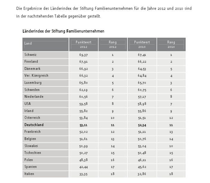 Da kaum ein anderes Land in der Wirtschaft so stark von Familienunternehmen geprägt ist wie Deutschland – sie beschäftigen laut ZEW 60 Prozent der in der Privatwirtschaft tätigen Arbeitnehmer – haben die Forscher die Untersuchung spezifisch auf die Bedingungen dieser Betriebe ausgerichtet. Und so zeigt sich auch die Stiftung Familienunternehmen enttäuscht von den schlechten Bedingungen und beklagt, dass die Familienunternehmer in Deutschland derzeit keinen Top-Standort mehr sehen könnten.