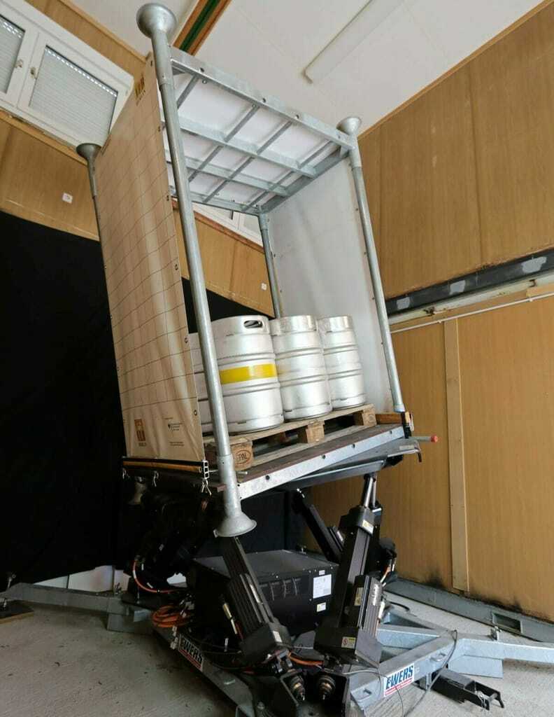 Um den Transport von Bier sicherer und umweltfreundlicher zu machen, nutzt die Versuchs- und Lehranstalt für Brauereien (VLB) einen mobilen Prüfstand. Mit der sogenannten "Motion Base" können die Forscher testen, wie sich Kästen und Fässer auf Paletten am besten sichern lassen.